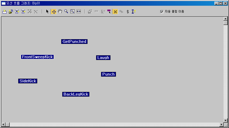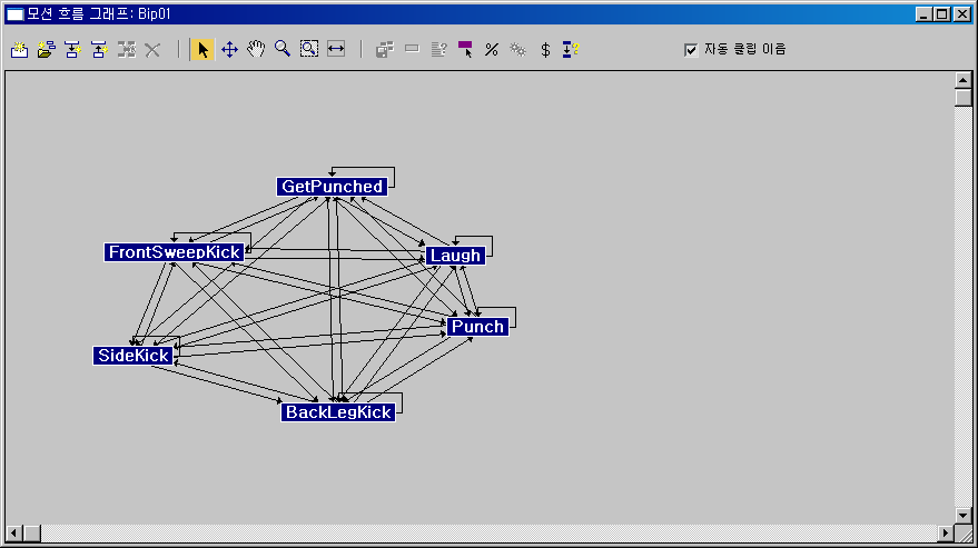 모션 흐름을 공유하는 Biped는 모션 흐름 그래프에 추가한 클립만 공유합니다. 스크립트는 해당 스크립트가 공유 모션 흐름의 클립을 가리키는 경우에도 각 Biped에 고유합니다. 각 Biped의 모션 흐름과 스크립트를 일반적인 방법으로 조작할 수 있습니다. 모션 흐름을 공유하는 Biped에 임의의 모션을 만들거나 집단 시스템을 사용하여 모션 흐름 스크립트를 만들 수 있습니다.
