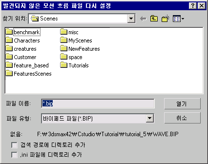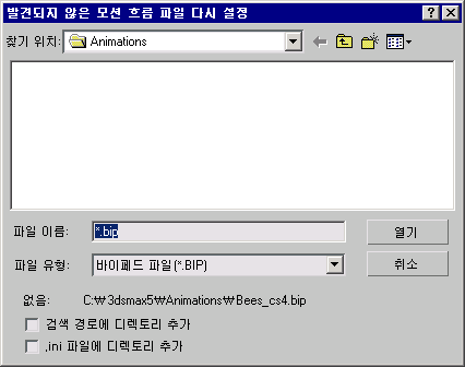 - 발견되지 않은 모션 흐름 파일 재설정 대화상자에서 3ds Max를 누락된 BIP 파일이 있는 폴더로 이동합니다.