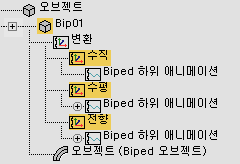 키 설정 또는 자동 키를 사용하여 COM의 위치나 방향에 대한 키를 지정할 경우 애니메이션 데이터가 각 Biped 변환 트랙에 저장됩니다.