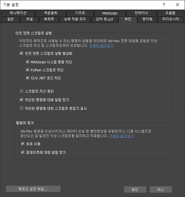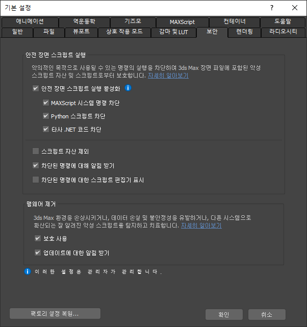 기본 설정 대화상자의 보안 패널에서 안전 장면 스크립트 실행과 관련된 옵션을 설정합니다.