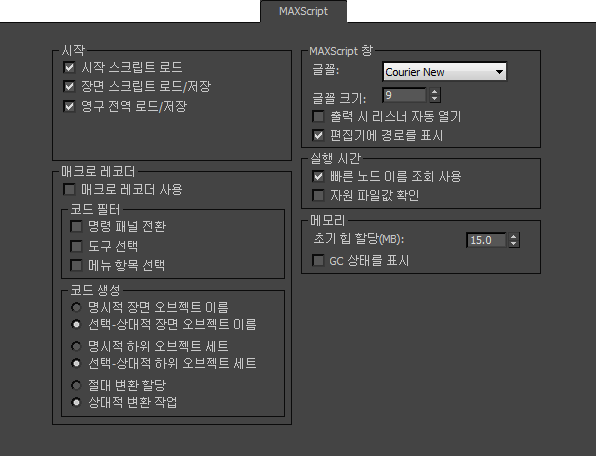 기본 설정 대화상자의 MAXScript 패널에서는 MAXScript와 매크로 레코더 기본 설정, 자동 스크립트 로드 활성화 또는 비활성화, 초기 힙 크기 설정, MAXScript 편집기에서 사용하는 글꼴 스타일 및 크기 변경 및 매크로 레코더에 대한 모든 설정 관리 작업이 수행됩니다.