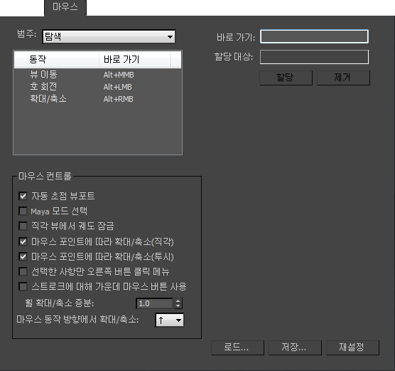 중요사항: 3ds Max 모드 및 Maya 모드에서 확대/축소 및 이동에 영향을 주는 마우스 설정(세 가지 바로 가기 설정 및 확대 방향)은 트랙 뷰, 모션 믹서, 모션 흐름, UVW 편집 대화상자 및 확장된 트랙 바("미니 곡선 편집기")의 창에도 영향을 줍니다.