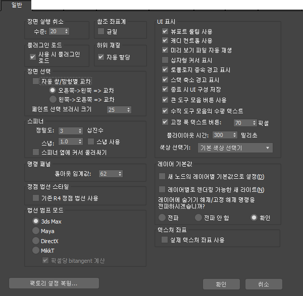 두 방법 모두 기본 설정 대화상자의 일반 패널을 엽니다. 스피너 스냅의 2개의 컨트롤은 이 패널의 스피너 그룹에 있습니다.