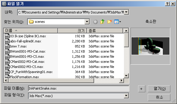 파일 열기 대화상자에는 표준 Windows 파일 열기 컨트롤이 있습니다. 오른쪽의 썸네일 영역은 좌측 리스트에서 하이라이트된 그 파일 이름의 배경 미리 보기를 보여줍니다.