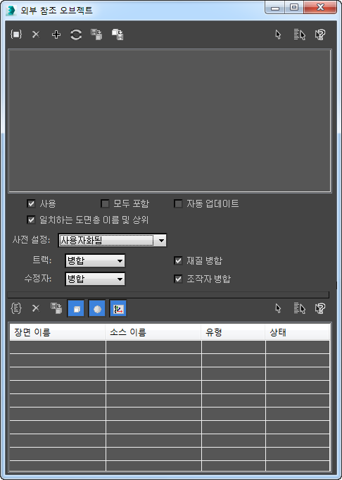 외부 참조 오브젝트 대화상자는 소스 장면(외적으로 참조하려는 엔티티를 포함하는 장면 파일)에서 외부 참조 엔티티를 주 장면(외부 참조를 만드는 장면)으로 로드하는 인터페이스를 제공합니다. 외부 참조 엔티티는 외부 참조 오브젝트, 변환 제어기, 재질 및 조작자가 될 수 있습니다. 외부 참조 레코드는 하나 이상의 외부 참조 엔티티로 구성됩니다.