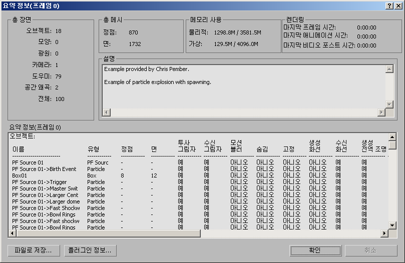 마지막 프레임, 애니메이션 및 비디오 포스트를 렌더링하는 데 걸린 시간입니다.