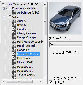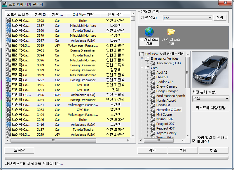 차량 오브젝트 리스트에서 선택한 항목에 적용할 임의 또는 개별 Civil View 차량 유형을 선택할 수 있습니다.