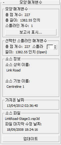 현재 선택된 스플라인의 속성에 대한 보고서를 제공합니다. 필드에는 스플라인의 길이와 스플라인에 있는 점(정점) 개수가 표시됩니다.