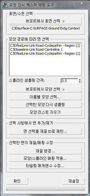 리스트에 모양을 처음 추가할 때 일부 면이 제대로 선택되지 않으면 스플라인 샘플링 간격 값을 줄인 다음, 이 버튼을 클릭하여 다시 모양 경로를 따라 면을 선택해 봅니다.