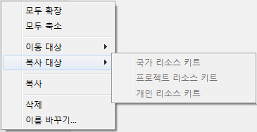 이 리스트의 항목을 마우스 오른쪽 버튼으로 클릭하여 오브젝트를 삭제하거나 이름을 바꾸거나 다른 리소스 키트로 이동하거나 복사합니다. 또한 마우스 오른쪽 버튼 클릭 메뉴를 사용하여 리스트 자체를 관리합니다.