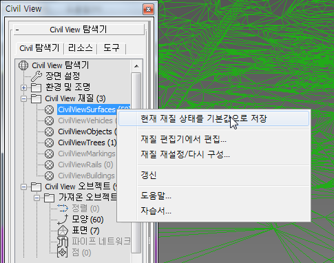 이 작업을 쉽게 수행하려면 3ds Max에서 재질을 개인 기본 설정으로 사용자화한 다음 Civil View 탐색기 패널에서 CivilViewSurfaces 재질을 마우스 오른쪽 버튼으로 클릭하고 현재 재질 상태를 기본값으로 저장을 선택합니다.
