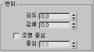 기본적으로 재배치는 중간값(50%) 회색을 0 재배치 값으로 사용하여 발광체의 중심을 결정합니다. 128이 넘는 회색 값은 재배치 기즈모에서 멀리 외향으로 재배치되며 128보다 작은 회색 값은 재배치 기즈모 방향인 내향으로 재배치됩니다. 중심 스피너를 사용하여 기본값을 조정합니다. 평면형 투영의 경우 재배치된 형상은 평면형 기즈모의 위나 아래에 위치합니다. 기본값은 0.5입니다. 범위는 0에서 1.0 사이입니다.