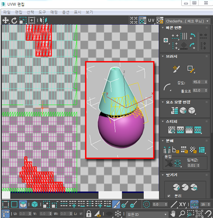 다각형의 UVW 좌표는 UVW 편집 창에 표시됩니다. 작업을 선택할 수 있는 다른 방법입니다.