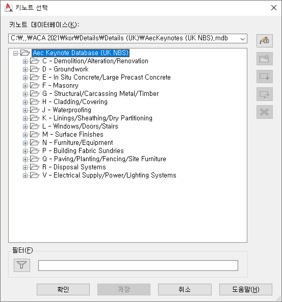 대화상자 맨 위의 키노트 데이터베이스를 선택합니다. AEC 키노트 데이터베이스는 상세 구성요소를 키노트하기 위한 기본값이며 AecKeynote-Assemblies 데이터베이스는 여러 구성요소의 조립품인 건축 객체를 키노트하기 위한 기본값입니다.
