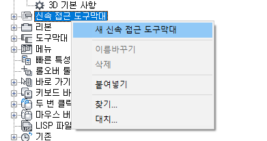 - 사용자화 탭에 있는 <파일 이름>의 사용자화 창에서 신속 접근 도구막대 노드를 마우스 오른쪽 버튼으로 클릭합니다. 새 신속 접근 도구막대를 클릭합니다.