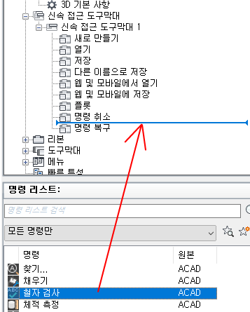 - 신속 접근 도구막대에 추가할 명령 또는 컨트롤을 명령 리스트 창에서 <파일 이름>의 사용자화 창으로 끕니다.