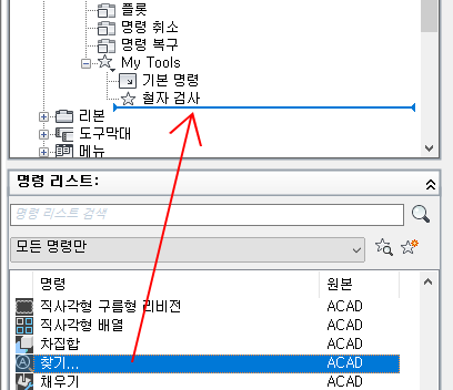 - 드롭다운 메뉴에 추가할 명령 또는 컨트롤을 명령 리스트 창에서 <파일 이름>의 사용자화 창으로 끕니다.