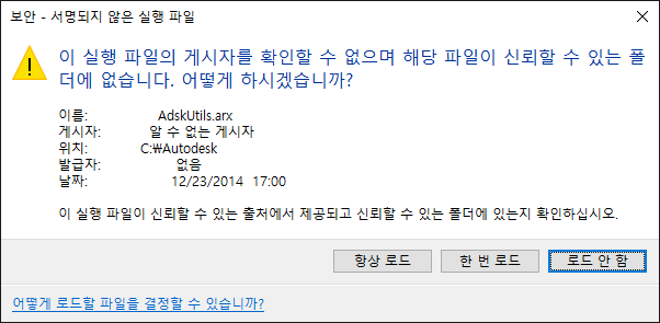해결 방법: 예상대로 파일을 로드하여 사용합니다. 필요에 따라, 게시자가 서명한 모든 파일에 대해 앞으로 메시지 상자가 표시되지 않도록 게시자를 신뢰할 수도 있습니다.