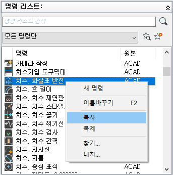 - 사용자화 탭의 명령 리스트 창에서 복사할 명령을 찾습니다.