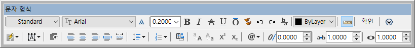 문자 형식 도구막대는 여러 줄 문자 객체를 작성하거나 편집할 때마다 표시됩니다. 이 도구막대는 단일 행 문자에는 사용할 수 없습니다.