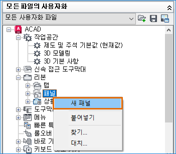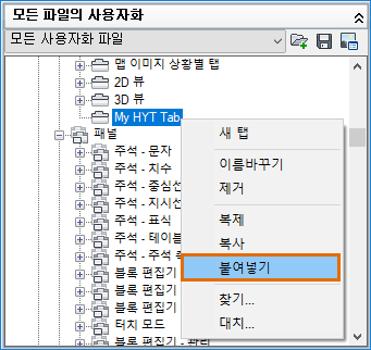 필요한 경우 CUI 편집기에서 새로 작성한 리본 패널(My HYT Panel)을 찾습니다.