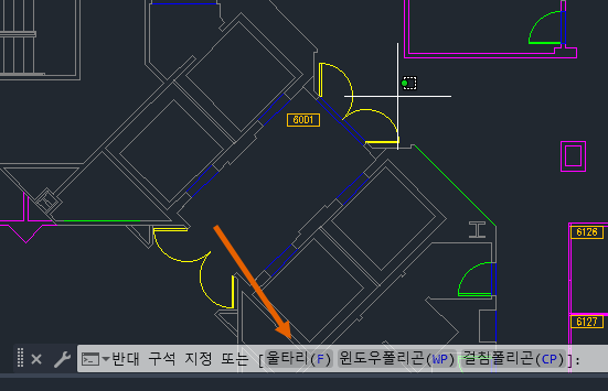 윈도우 폴리곤: 한 번 클릭하여 윈도우 선택을 시작합니다. 명령 프롬프트에서 윈도우 폴리곤에 해당하는 wp를 입력합니다. 점을 계속 지정합니다. 폴리곤을 닫을 필요가 없습니다. Enter 키를 누르면 자동으로 닫힙니다. 윈도우 폴리곤으로 둘러싸인 객체가 선택됩니다.
