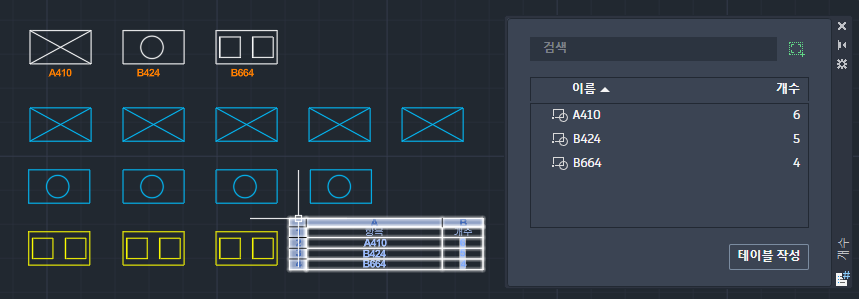 개수 팔레트에는 입력한 문자로 시작하는 블록 이름이 표시됩니다. 이 기능은 이름을 기준으로 블록과 해당 개수를 신속하게 찾아야 하는 경우에 유용합니다.