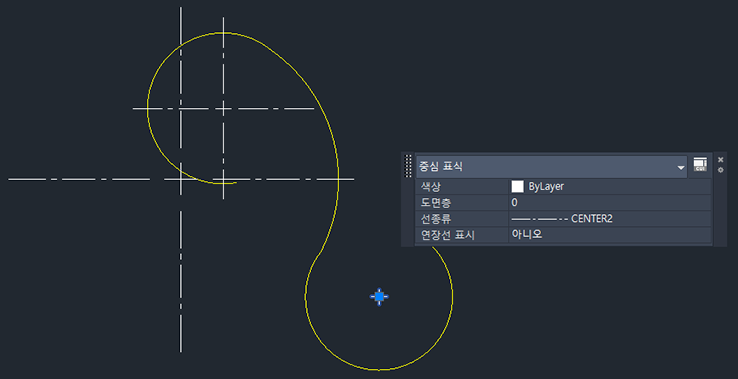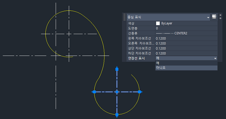 특성 팔레트를 사용하여 특성을 변경할 수도 있습니다. 특성 팔레트가 표시된 상태에서 보려는 중심 표식 또는 중심선을 선택하고 색상, 교차 크기, 교차 간격, 확장 길이 등과 같은 특성을 변경합니다.