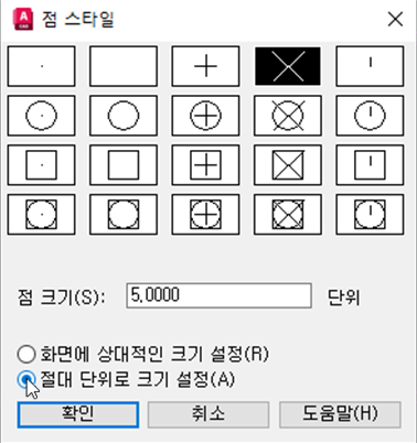 점 객체의 크기가 화면표시 화면의 크기에 의해 결정되는지 여부를 선택할 수 있습니다. 즉, 점의 크기는 점을 작성할 때 줌 확대 방식에 따라 달라지거나, 점이 절대 크기로 설정되어 있는지에 따라 달라집니다.