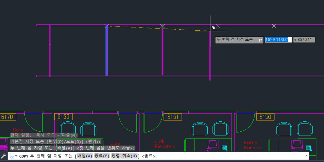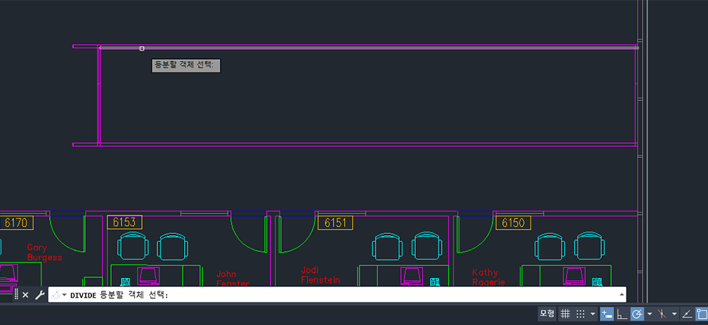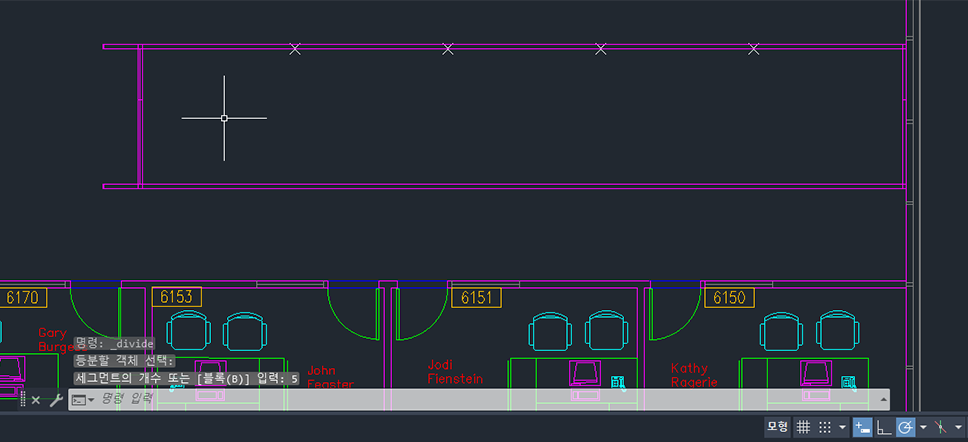 벽을 추가하여 이러한 벽 사이의 빈 공간에 5개의 사무실 칸막이를 작성한다고 가정합니다. 이 연습을 직접 다시 작성하려면 Floor Plan Sample.DWG 샘플 도면을 사용하여 칸막이 6156~6162를 삭제하거나, 새 도면을 작성하고 유사한 모양의 직사각형을 간단히 그려서 사무실 벽을 나타낼 수 있습니다.