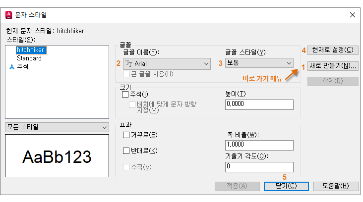 새 문자 스타일을 작성할 때 이름을 지정한 다음 글꼴 및 글꼴 스타일을 선택합니다. 버튼 클릭 순서는 아래와 같습니다.