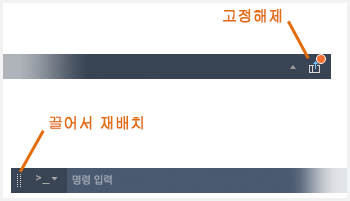명령 윈도우를 고정해제할 수 있습니다. 고정해제된 명령 윈도우나 부동 상태의 명령 윈도우는 화면에서 왼쪽 또는 오른쪽 끝에 있는 막대를 끌어 재배치할 수 있습니다.