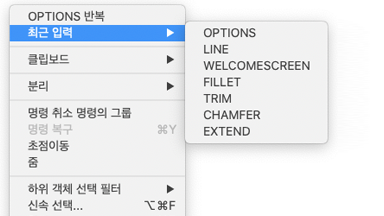 바로 가기 메뉴의 최근 입력을 사용하여 명령 또는 명령 입력을 반복합니다. 마우스 오른쪽 버튼을 클릭하여 바로 가기 메뉴를 표시합니다.