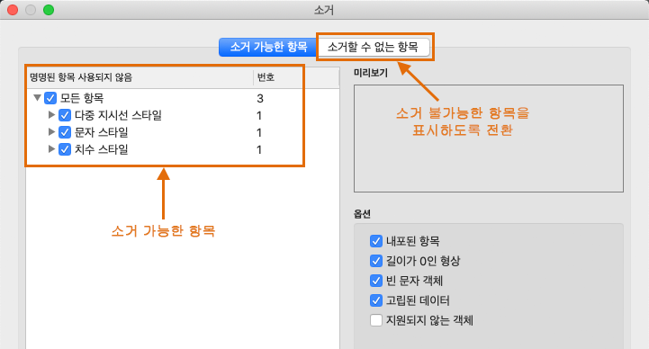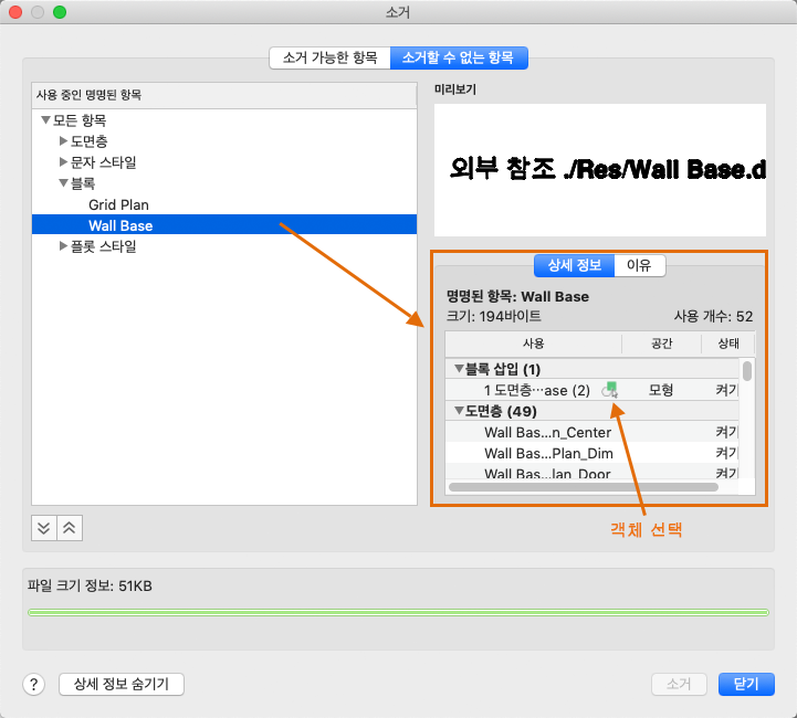 소거 대화상자에서 소거할 수 없는 객체를 표시할 수 있습니다. 소거할 수 있는 항목 리스트와 소거할 수 없는 항목 리스트 간을 전환합니다.