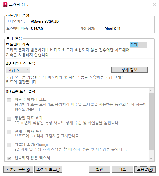 - 부드러운 선 표시 및 높은 품질 형상과 같은 2D 옵션의 화면표시를 조정합니다. 기본적으로 부드러운 선 표시, 높은 품질 형상 및 비디오 캐싱 메모리 레벨 옵션은 화면표시에서 축소되어 있습니다. 상세 정보 버튼을 클릭하면 이러한 옵션을 볼 수 있습니다.