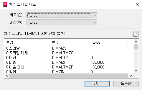 DIMSTYLE(명령) 찾기: 치수 스타일 선택 > 비교