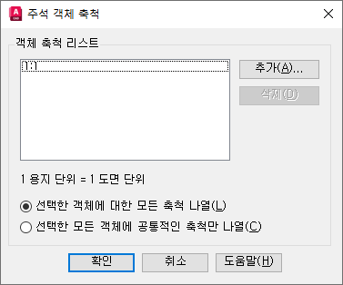 선택한 주석 객체에 지원되는 축척을 추가 또는 삭제합니다.