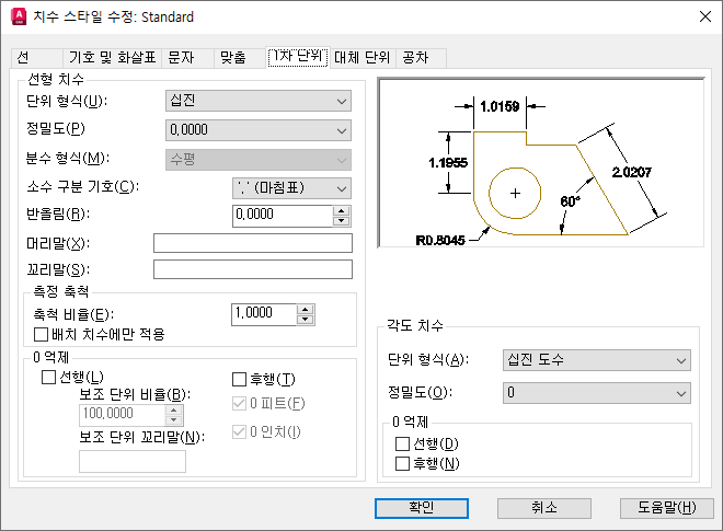 1차 치수 단위의 형식과 정밀도를 설정하고 치수 문자의 머리말과 꼬리말을 설정합니다.