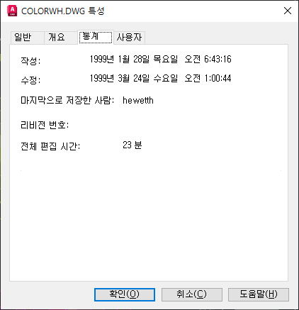 도면의 편집에 걸린 전체 시간을 표시합니다. 이 값은 TDINDWG 시스템 변수에 저장됩니다.