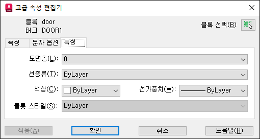 속성이 켜진 도면층과 속성 문자의 선가중치, 선종류 및 색상을 지정합니다. 도면이 플롯 스타일을 사용하는 경우, 특성 탭을 사용하여 속성에 플롯 스타일을 지정할 수 있습니다.