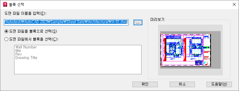 지정된 전체 도면 파일 또는 도면 템플릿 파일을 블록 정의로 사용합니다.