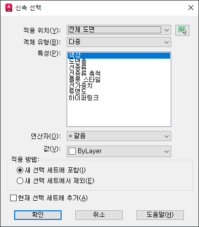 현재 선택 세트에 추가를 선택한 경우 필터링 기준을 전체 도면에 적용합니다.