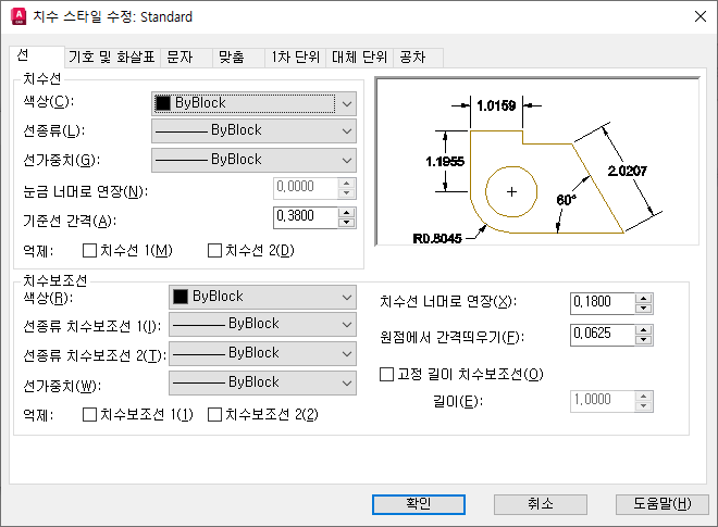 치수 선, 치수보조선, 화살촉 및 중심 표식의 특성과 형식을 설정합니다.