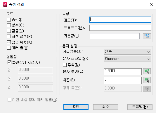 속성의 위치를 지정합니다. 좌표 값을 입력하거나, 화면상에 지정을 선택하고 좌표 입력 장치를 사용하여 다른 객체를 기준으로 속성의 위치를 지정합니다.