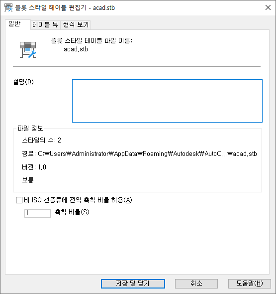 편집하고 있는 플롯 스타일 테이블에 관한 정보 즉, 플롯 스타일의 수, 경로 및 플롯 스타일 테이블 편집기의 버전 번호를 표시합니다.