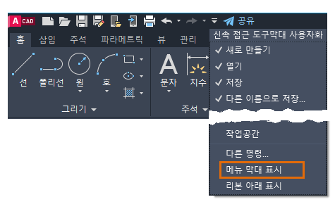 메뉴 막대는 빠른 액세스 도구 모음 드롭다운에서 사용할 수 있거나 CUI로 사용자 인터페이스를 사용자화하여 사용할 수 있습니다.