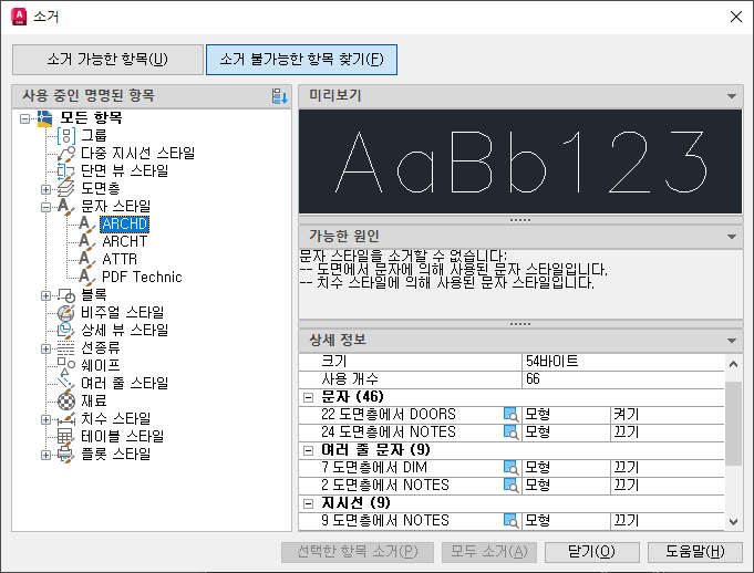 이러한 객체의 대부분은 현재 도면에서 사용되고 있거나 제거할 수 없는 기본 항목입니다. 개별 명명된 객체를 선택할 때 항목을 소거할 수 없는 이유가 표시됩니다.