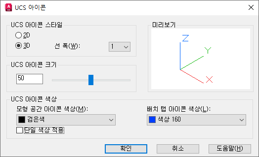 2D 또는 3D UCS 아이콘의 표시와 그 모양을 지정합니다.