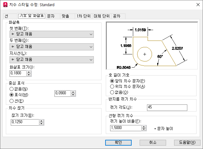 호 길이 치수의 원호 기호 표시를 조정합니다. (DIMARCSYM 시스템 변수)