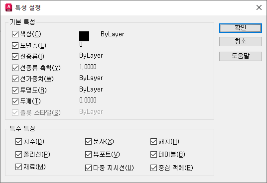 대상 객체의 도면층을 원본 객체의 도면층으로 변경합니다. 모든 객체에 사용 가능합니다.